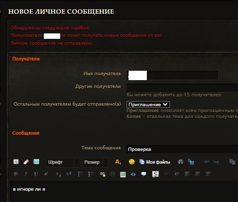 ...Вот ещё "проблема": если я кому-то написал длинный текст, то лишь после (а не до) моей попытки отправки этого текста вижу, что "пользователь ... не хочет принимать личные сообщения от вас". Впору посылать сперва короткое сообщение "этому" пользователю, а уж потом начать сочинять длинное.