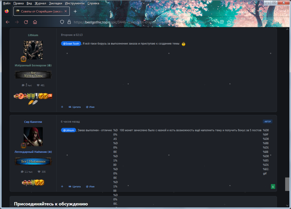 Не видны (в том и другом браузерах) смайлы именно от Сира Канегема. От других - видны, а от Канегема - нет. Это касается не только свежих сообщений, но и сообщения девятимесячной (?) давности.